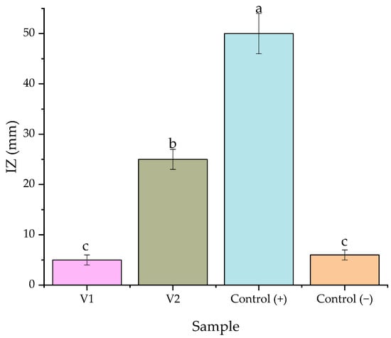 Antimicrobial potential of V1 and V2 samples against P. viticola in laboratory conditions. Control (+)—positive control (Pergado F 45 WG), Control (−)—negative control (hydroalcoholic solution). The values represent means ± SD. Means of the same parameter without a common lowercase letter (a to c) differ (p < 0.05) as analyzed by one-way ANOVA and the TUKEY test.