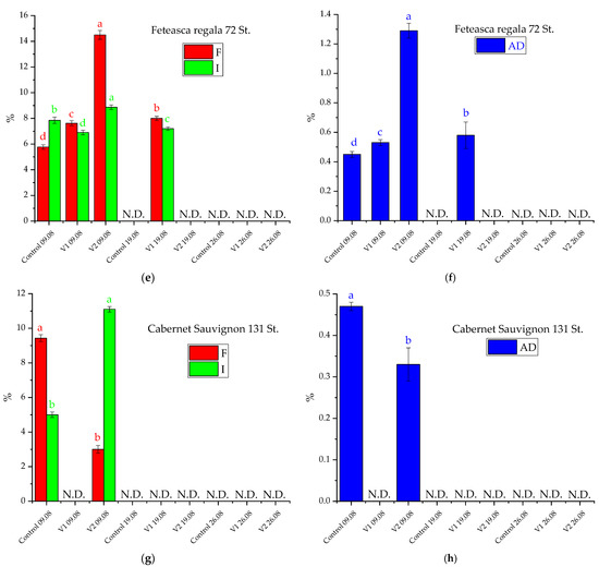 Frequency (F), intensity (I), and attack degree (AD) evolution of U. necator during successive treatments in 2019 on the studied clones: (a,b): Feteasca alba 97 St; (c,d): Feteasca neagra 6 St; (e,f): Feteasca regala 72 St.; (g,h): Cabernet sauvignon 131 St.. The values represent means ± SD. Means of the same parameter (same color) without a common lowercase letter (a to e) differ (p < 0.05) as analyzed by one-way ANOVA and the TUKEY test; V1 = alcoholic extract of D. filix-mas, V2 = alcoholic extract of D. filix-mas with silver nanoparticles, C—control (chemical pesticide); N.D.—not detected (no pathogen attack registered).