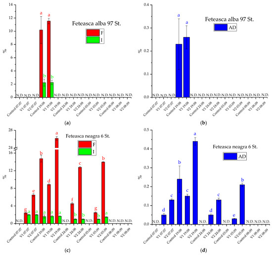 Frequency (F), intensity (I), and attack degree (AD) evolution of U. necator during successive treatments in 2020 on the studied clones: (a,b): Feteasca alba 97 St; (c,d): Feteasca neagra 6 St; (e,f): Feteasca regala 72 St. The values represent means ± SD. Means of the same parameter (same color) without a common lowercase letter (a to g) differ (p < 0.05) as analyzed by one-way ANOVA and the TUKEY test; V1 = alcoholic extract of D. filix-mas, V2 = alcoholic extract of D. filix-mas with silver nanoparticles, C—control (chemical pesticide); for the Cabernet Sauvignon 131 St. clone, all the registered results were null; N.D.—not detected (no pathogen attack registered).