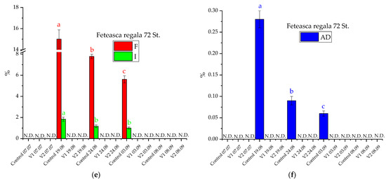 The experimental observations on the occurrence of powdery mildew and downy mildew in the studied grapevine plants, together with the time and space disease evolution, were monitored for highlighting different levels of attack for each clone. On the studied grapevines, only powdery mildew appeared in the studies from 2019 and 2020. Thus, on 9 August, 19 August, and 26 August 2019, the F, I, and AD evaluations were performed for estimating powdery mildew on the grapevine plants studied (Figure 4). The symptoms were different from one genotype to another. For Feteasca alba Feteasca alba 97 St., a powdery mildew attack in all three groups (control and experimental) was registered (on 9 August 2019). Furthermore, after the first treatment application, considering the symptoms’ appearance, the attack was stopped only in the case of V1 (when the plants were sprayed with alcoholic extract of D. filix-mas). After the third treatment, the attack was stopped in all three groups (control and experimental). The control plants of Feteasca neagra Feteasca neagra 6 St. did not register a powdery mildew attack. On the other hand, in the case of plants from V1 and V2 experimental groups, the attack of powdery mildew stopped after the last treatment application.