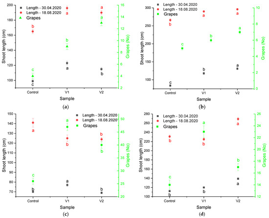 Influence of the applied treatments on young shoot length and number of grapes on the studied clones: (a) Feteasca alba 97 St; (b) Feteasca neagra 6 St; (c) Feteasca regala 72 St.; (d). Cabernet Sauvignon 131 St. The values represent means ± SD. Means of the same parameter (same color) without a common lowercase letter (a–c) differ (p < 0.05) as analyzed by one-way ANOVA and the TUKEY test; V1 = alcoholic extract of D. filix-mas, V2 = silver nanoparticles phytosynthesized using the alcoholic extract of D. filix-mas, Control—chemical pesticide.