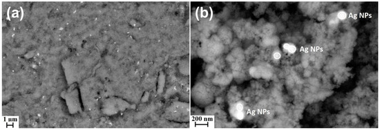Figure 2 presents the results of SEM analyses with the use of the angle-selective backscatter (AsB) detector for the ZnO+1%Ag NPs sample. The AsB detector made it possible to achieve a clear composition contrast between zinc oxide and silver, which enables an easy identification of Ag nanoparticles in the SEM images. The SEM image (Figure 2a) confirms a homogeneous distribution of Ag particles in the ZnO+1%Ag NPs sample. It must be underlined that obtaining a homogeneous mixture of ZnO NPs with Ag NPs in the nanoscale is technologically very difficult. The microwave solvothermal co-synthesis method makes it possible to obtain a homogeneous mixture of two products of synthesis, ZnO and Ag, during a single process. It must be emphasized that in the microwave solvothermal co-synthesis reaction, a solution of reagents was used, in which an identical concentration of ZnO NPs and Ag NPs precipitated in the whole volume during the temperature increase. The SEM results (Figure 2) prove that spherical Ag NPs approx. 70–100 nm in size occur in the form of agglomerates/aggregates composed of at least two/three nanoparticles. ZnO NPs form a physical barrier that restricts further Ag NPs agglomeration/aggregation processes in a dry sample.