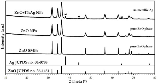 The crystalline structure of the ZnO samples was tested by the XRD method, while the results of the analyses are presented in Figure 3. The XRD result for the reference sample of hexagonal wurtzite structure ZnO (JCPDS card no. 36-1451) is characterized by the presence of diffraction peaks with the following 2 theta values: 31.77°, 34.42°, 36.25°, 47.54°, 56.60°, 62.86°, 66.38°, 67.96°, 69.10°, 72.56° and 76.95° [47]. The XRD result for the reference sample of the cubic crystal structure Ag (JCPDS card no. 04-0783) is characterized by the presence of diffraction peaks with the following 2 theta values: 38.12°, 44.28°, 64.43° and 77.47° [48]. All diffraction peaks obtained in the XRD results for the ZnO NPs and ZnO SMPs samples originated from the hexagonal phase ZnO with the wurtzite structure (Figure 3). No presence of foreign crystalline phases was found in the ZnO NPs and ZnO SMPs samples within the detection limits of the applied XRD method. The XRD results indicated the presence of diffraction peaks originating from hexagonal phase ZnO with the wurtzite structure and cubic crystal structure of Ag in the ZnO+1%Ag NPs sample (Figure 3). The ZnO+1%Ag NPs sample, similarly to the others, did not contain any crystalline impurities. Analogous XRD results for ZnO+Ag NPs samples are reported by other research groups [34,35,36,44,49,50].