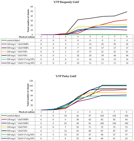 In ‘UTP Burgundy Gold’ cultivar, the regeneration of first shoots was observed in the third week of culture on internodes treated with 100 mg·L−1 ZnO SMPs and with ZnO NPs applied at both tested concentrations. During the next week, shoots appeared on internodes in other experimental treatments, except for the control object, where no regeneration was observed during the whole culture period. Interestingly, the highest increase in the number of shoots was reported in the fourth week, especially on internodes treated with ZnO NPs and ZnO+1%Ag NPs, irrespective of the tested concentration. As for the ZnO SMPs treatments, the regeneration was most intensive in the fifth week. During the following culture weeks, the dynamic of shoot regeneration was moderate. Finally, in the eighth week, the highest number of 49 shoots was reported on the internodes treated with 100 mg·L−1 ZnO SMPs, while the lowest number of 10 shoots was observed on the 500 mg·L−1 ZnO+1%Ag NPs-treated explants (Figure 5 and Figure 6).