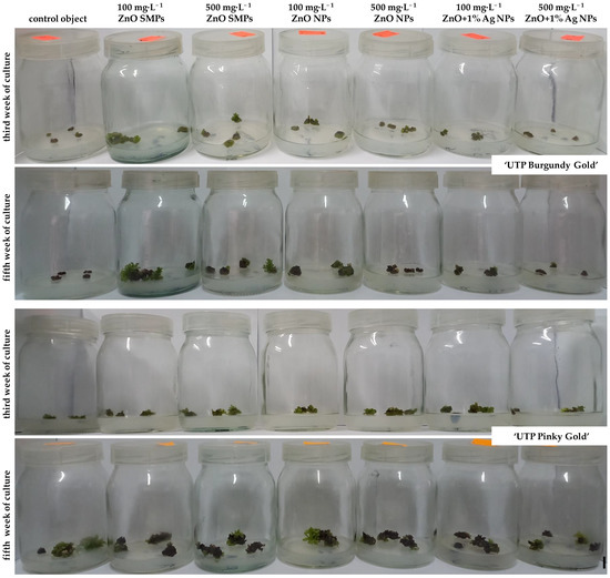 Two Chrysanthemum × morifolium (Ramat.) Hemsl. cultivars: ‘UTP Burgundy Gold’ and ‘UTP Pinky Gold’, were used in the experiment. Aseptic internodes, dissected from plantlets cloned previously with the single-node method on the modified MS medium without plant growth regulators, were used as explants. Four explants per each culture jar were placed horizontally on the medium. Immediately after the inoculation onto the medium, the explants were treated with zinc oxide submicron particles suspension (ZnO SMPs), zinc oxide nanoparticles suspension (ZnO NPs), or zinc oxide and silver nanoparticles suspension (ZnO+1%Ag NPs), at the concentration of 100 or 500 mg·L−1 selected on the basis of preliminary research (data not shown). The tested suspensions were sterilized in an autoclave, and before application, placed for 30 min in the Elmasonic S80(H) Ultrasonic Cleaner with the ultrasonic frequency of 37 kHz and the effective ultrasonic power of 150 W (Elma Schmidbauer GmbH, Singen, Germany) to achieve proper dispersion of particles. Suspensions were poured onto the culture medium with an automatic pipette with a sterile tip, 2 mL of each suspension, at each tested concentration per culture jar. Non-treated explants were used as the control object.