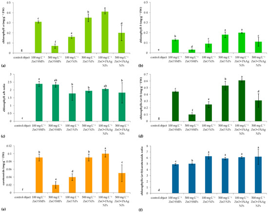 As for the results of biochemical analysis, the highest content of chlorophyll a, chlorophyll b, total chlorophylls, and carotenoids was found in ‘UTP Burgundy Gold’ shoots regenerated on 100 mg·L−1 ZnO+1% Ag NPs-treated internodes. Nevertheless, the application of the same sample, but at 500 mg·L−1, resulted in a significant decrease in the content of these metabolites compared to the lower concentration. Shoots from the treatments, which provided the best results in terms of regeneration efficiency, i.e., 100 mg·L−1 ZnO SMPs and 500 mg·L−1 ZnO NPs, were characterized by a high or moderate capability for metabolites biosynthesis. Shoots formed on explants treated with 500 mg·L−1 ZnO SMPs or 100 mg·L−1 ZnO NPs had low contents of chlorophyll a, chlorophyll b, total chlorophylls, and carotenoids. Interestingly, compared to submicron particle treatments, nanoparticle treatments resulted in a significant increase in the values of the chlorophyll (a+b)-to-carotenoid ratio and decreasing chlorophyll a/b ratio (Figure 7).