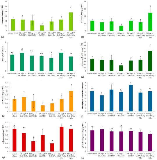 On the other hand, in chrysanthemum ‘UTP Pinky Gold’, no significant differences were found between the tested experimental treatments in terms of chlorophyll a, chlorophyll b, total chlorophylls, and carotenoids contents in the regenerated shoots. The highest (1.71–1.92) chlorophyll a/b ratios were found in the control object and as a result of 100 mg·L−1 ZnO SMPs, and 100 mg·L−1 ZnO+1%Ag NPs treatments. Simultaneously, the highest chlorophyll (a+b)/carotenoid ratios were identified for the control object, 500 mg·L−1 ZnO SMPs, and 500 mg·L−1 ZnO NPs samples. Treatment with ZnO SMPs and ZnO NPs, especially at a higher concentration, negatively affected the ability of shoots to synthesize anthocyanins compared to the control object and application of ZnO+1%Ag NPs. Interestingly, the content of phenolic compounds in the shoots was similar in the control and ZnO SMPs/ZnO NPs treatments, whereas the use of material samples with silver nanoparticles suppressed the biosynthesis of these compounds (Figure 8).