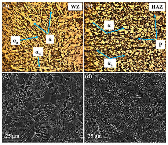 OM and SEM images showing the microstructures of the first weld: (a,c) weld zone (WZ), (b,d) heat-affected zone (HAZ).