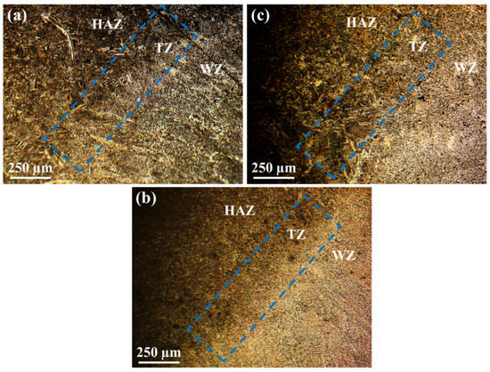 OM images showing the microstructures of the transition zone (TZ): (a) first weld, (b) second weld, and (c) the third zone.