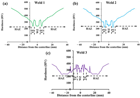 The profile of microhardness across the weldments: (a) first weld, (b) second weld, and (c) third weld.