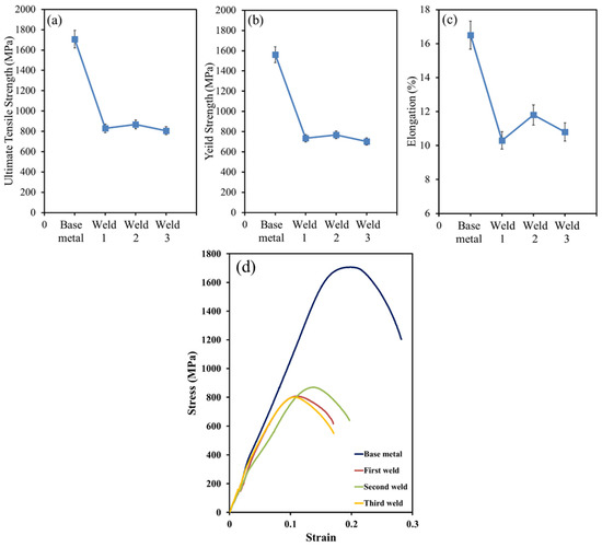 Figure 10 illustrate the tensile properties of BM and different welds using three filler metals. The ultimate tensile strength, yield strength, and elongation of BM were higher than those of all three welds. These considerable tensile properties are due to the microstructure of Hardox 500 steel, which is the martensite. However, the differences in the values of the welds are mainly attributed to the amount of acicular ferrite in the WZ rather than allotriomorphic and Widmanstätten ferrites. Acicular ferrite is extensively known as a desirable microstructure. It should be noted that the dispersion of fine alloy carbide in the temperature range of welding may markedly increase the strength, which confirms our observations.