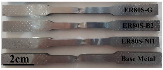From Figure 11, it can be seen that necking took place at fracture sections. Deformation caused by tensile test hardens the steel, and if at some point the loading rate at which it hardens is not sufficient to withstand the reduction in area, the deformation becomes focused, which thus leads to necking. Expectedly, a fracture occurred on the WZ, which is believed to be weaker than the HAZ and the BM. Furthermore, void nucleation takes place preferentially in the ferrite and then, during tension, the high density of voids often leads to localized necking [59,60].