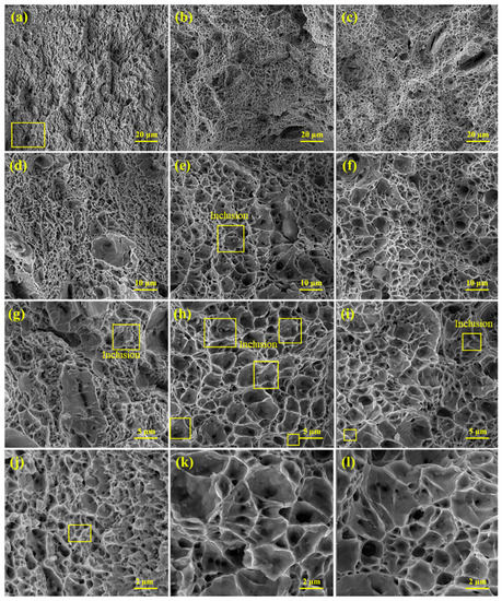The fracture surfaces of tensile test pertaining to all three welds at different magnifications. (a,d,g,j) the first weld, (b,e,h,k) the second weld, and (c,f,i,l) the third weld.