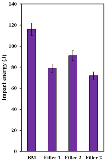 The values of the energies are highlighted in Figure 13. The values are much higher than many other reported values [50,61,62] and, interestingly, the impact toughness of all three welds represents higher values than the base metal (BM). This is certainly because of the presence of acicular ferrite, which is highly considered a favorable phase showing desired toughness. The formation of this phase leads to interlocked microstructure, thus resulting in better toughness properties [63].