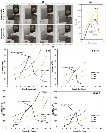 Force versus crack length is presented in Figure 16b. These values were achieved after applying fracture toughness test. By using the equations below [66], based on the ASTM-E561 standard, the plane stress fracture toughness (kri) values of base metal and all three welds were calculated.