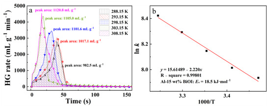 where k refers to the MHGR (mL g−1 min−1), A is the pre-exponential factor, Ea is the apparent activation energy, R is the gas constant (8.314 J mol−1 k−1), and T is the initial reaction temperature. Figure 4b provides a plot of ln k vs. 1000/T, and the apparent activation energy for the reaction of Al-15 wt% BiOI with water is 18.5 kJ mol−1. This value is far below that of the reaction between the Al-15 wt% BiOCl and water (26.9 kJ mol−1) [24], which further demonstrates that Al-15 wt% BiOI has a higher reactivity than that of Al-15 wt% BiOCl.