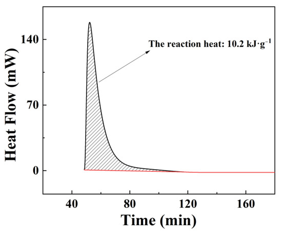Meanwhile, a C80 calorimeter was used to measure the reaction heat of Al-15 wt% BiOI hydrolysis reaction. Figure 5 clearly shows that the reaction heat of Al-15 wt% BiOI with water is 10.2 kJ g−1. According to the heat of reaction between pure Al and water being 16.45 kJ g−1 [36], the theoretical reaction heat of Al-15 wt% BiOI should be 14.0 kJ g−1. The actual measured value is less than the theoretical value due to the solid-phase reaction between Al and BiOI during sample preparation, resulting in the consumption of a small amount of Al (see Figure 6a).