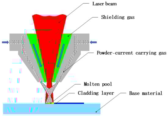The heat source was a German Laserline LDM6000-100 laser, the laser wavelength was 1070 μm, the core diameter of the fiber was 600 μm, and the laser-cladding-head focal length was 267 mm. The laser power was 2000 W, the feeding rate of the powder was 30 g/min, the laser scanning speed was 10 mm/s, and the lapping rate was 35%. High purity Ar (≥99.9%) was used as the powder carrier gas and guard gas. The carrier gas flow rate was 9 L/min and the guard gas flow rate was 15 L/min. As illustrated in Figure 2, the laser cladding was performed by coaxial powder feeding. The principle is as follows: metal alloy powder is converging on the surface of the substrate at a uniform velocity through the coaxial powder feeding nozzle under the action of current-carrying gas, and the size of the powder is identical with the size of the laser spot. Moreover, the high-energy laser beam is focused on the center of the powder spot, so that the powder and matrix can melt rapidly to form a laser molten pool. When the spot leaves the molten pool by scanning forward at a uniform velocity, the molten pool is quenched and solidified, and the cladding material and a very small amount of matrix material form a cladding layer combined by metallurgy. Using a YASKAWA MOTOMAN-SP100 six-axis industrial robot, the laser scanning movement and control are implemented. In order to isolate the influence of thin-action release of Fe element in the matrix for the experiment, the multilayer cladding method was adopted in this study.