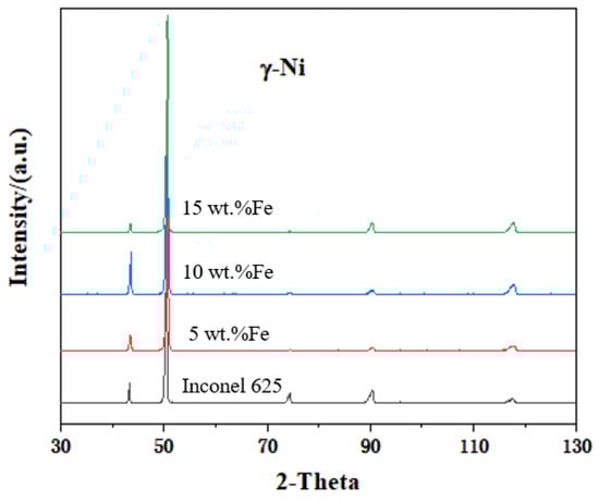 The crystal structures of the cladding layers were analyzed by a D8 X-ray diffractometer (Cu target Kα ray scanning, scanning range 30°~130°, scanning rate 5°/min). The XRD patterns of the cladding layers are shown in Figure 3.