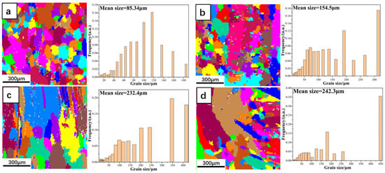 Grain size distribution of Inconel 625 alloy cladding with different Fe contents: (a) Inconel 625; (b) 5 wt.% Fe; (c) 10 wt.% Fe; (d) 15 wt.% Fe.