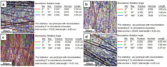 Grain boundary angle of Inconel 625 alloy cladding with different Fe content: (a) Inconel 625; (b) 5 wt.% Fe; (c) 10 wt.% Fe; (d) 15 wt.% Fe.