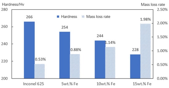 An Ht-1000 high-temperature friction and wear testing machine was used for a 500 °C friction and wear test. The grinding ball was made of GCr15, the friction and wear-round sample had a diameter of 30 mm and thickness of 11mm. After polishing the surface of each cladding layer, the weight of the friction and wear samples was balanced to be equal by grinding the substrate, and the weight-loss ratio was compared. The friction and wear testing machine has 100 r/min, the friction radius was 10 mm, the load was 100 N, and the test time was 60 min. As shown in Figure 8, with the increase in Fe content, the wear resistance of the cladding layer was reduced, and the wear resistance was consistent with the hardness variation in the cladding layer. The higher the hardness of the cladding layer, the better the wear resistance. Controlling the low dilution rate of Fe can improve the wear resistance of the cladding layer at high temperature.