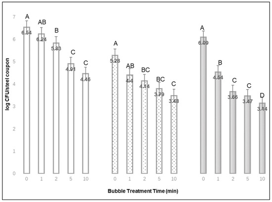 Stainless-steel coupons were treated for 0, 1, 2, 5 or 10 min using the bubble diffuser with a 1.0 L/min air flow rate. Three steel samples were tested for each combination of inoculum drying time and bubble treatment time. After treatment with a stream of heavy bubbles, stainless-steel coupons were collected in a sterile bag with peptone water and sonicated (Aquasonic Ultrasonic Cleaner, Volts: 117/120, 50/60 Hz) for 2 min at room temperature. Solutions were then diluted with peptone water and plated onto Oxford agar (Neogen, Lansing, MI, USA) plates. Plates were incubated at 35 °C for 48 h. Three replications of the above process were conducted for a total of 108 samples.