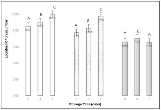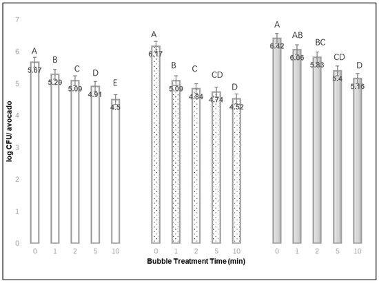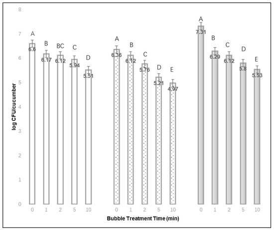 Fresh cucumbers and avocados were stored in a refrigerator at 10 °C for up to 7 d. After storage for 0, 1, 4, or 7 d, three cucumbers and three avocados were individually placed in a sterile bag, diluted with peptone water, and solutions were plated onto Tryptic Soy Agar plates. Additional cucumbers and avocados were treated to a heavy bubble stream, as described previously, for 2 or 10 min. These samples were stored for either 0, 1, 4 or 7 d at 10 °C. After storage, three cucumbers and three avocados (from each storage time) were individually placed in a sterile bag, diluted with peptone water, and solutions were plated onto Tryptic Soy Agar plates. All plates were incubated at 35 °C for 24 h, then enumerated. The above process was repeated for 3 replications.