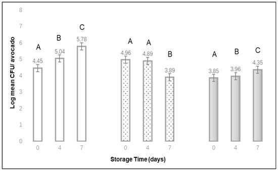 2.6. Microbial Quality Evaluation of Treated Cucumbers and Avocados after Refrigerated Storage (10 °C)