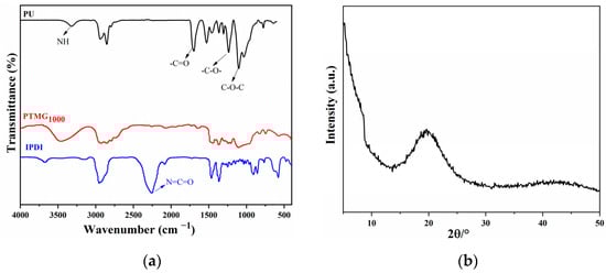 (a) FTIR spectrum of PU0.4, PTMG1000 and IPDI; (b) XRD pattern of PU0.4.