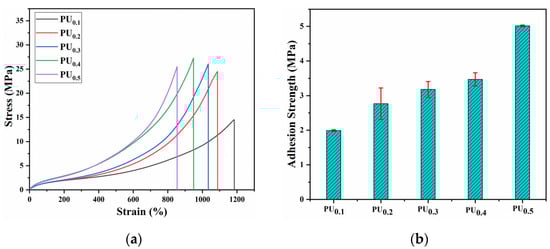 (a) Stress-strain curves and (b) adhesion strength of PU0.1–PU0.5.