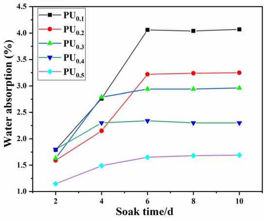 The water absorption of a PU coating must be controlled within a certain range to avoid adverse effects on component operation due to its long-term service in the water environment. Figure 4 shows the water absorption curves of PU0.1–PU0.5 coatings as a function of immersion time. With time, the water absorption of all coatings increased and then gradually tended to be stable, that is, to reach the saturation state. This was mainly because polyurethane is a network crosslinked structure, and water molecules were very rapidly adsorbed on the coating surface or into the coating at the early stage of immersion, so the water absorption increased rapidly. Over time, the water molecules that had previously diffused in prevented more water molecules from entering the coating, thus keeping the water absorption stable.