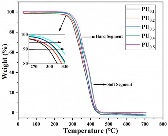 Table 2 provides the initial decomposition temperatures of the five polyurethanes at mass losses of 5% and 10%, denoted by T5% and T10%, respectively. Obviously, the thermal stability gradually increased with the increase of TMP content. T5% and T10% of PU0.1 were only 280 and 298 °C, while those of PU0.5 were up to 310 and 326 °C, increases of 10.7% and 9.39%, respectively. This lied in that as the amount of TMP added increased, the content of junctions in polyurethane increased, and the arrangement of hard segment microregion became more regular, which gave the polyurethane more reticular crosslinking structures that could improve the heat resistance of the material [34,35].