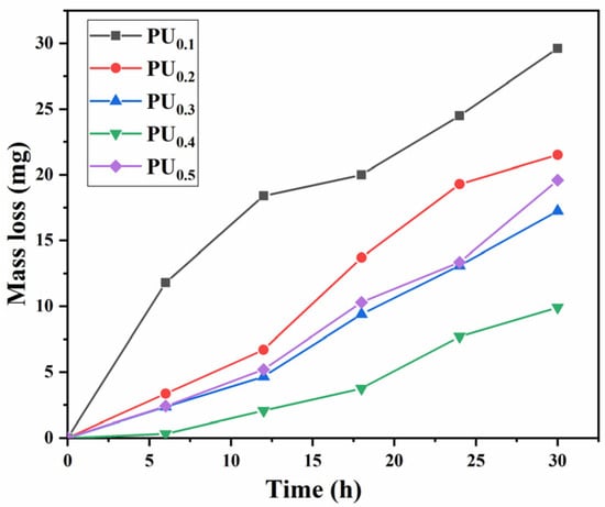 It could also be seen from Figure 6 that the loss rate of the five coatings was relatively slow at the beginning of the experiment and accelerated at the middle and late stages. Even the loss rate of PU0.4 coating with the best CE resistance also became faster after CE 20 h. Since the coating surface was always under the continuous action of tens of thousands of bubbles collapsing in the CE process, the CE performance should be not only related to the original molecular structure and mechanical properties of PU but also highly related to their dynamic evolution with CE time. In addition to some pores caused by the release of CO2 from the reaction between –NCO and H2O during wet curing [38], there were also some craters caused by cavitation heat on the coating surface after a long time of CE [39], which promoted the formation and expansion of cracks along them more easily, resulting in the significant increase of wider and deeper fatigue cracks in the CE area (see Figure 7). Brittle exfoliation was more likely to occur at the intersection of cracks, which should be an important reason for the faster loss of PU coatings at the middle and late stages.
