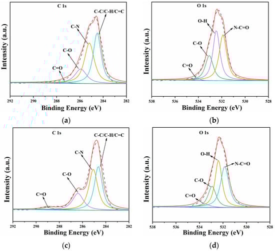To better explore the changes in different chemical bonds or functional groups, fine fitting of C 1s and O 1s peak was carried out. As shown in Figure 9, the C 1s peak could be divided into four characteristic peaks located at 287.4 eV, 286.7 eV, 285.1 eV and 284.6 eV, which corresponded to the chemical bonds of C=O, C–O, C–N and C–C/C–H/C=C, respectively [42,43]. O 1s peak also could be divided into four characteristic peaks located at 534.2 eV, 533.3 eV, 532.6 eV and 532.1 eV, which corresponded to C=O, C–O, O–H and –NCO, respectively [44,45]. The intensity of the C=O peak was clearly significantly enhanced after CE, which meant that the cavitation heat might intensify the hydrolysis and thermal oxidation of polyurethane.