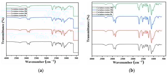 In order to better study the effect of cavitation heat on polyurethane surfaces, the evolution of its chemical structure with CE time was further characterized by FTIR. Figure 10a,b show the ATR-FTIR spectrum of the PU0.1 and PU0.4 coatings after different CE times. The absorption peak area in the FTIR spectrum represented the content of corresponding functional groups to some extent, so the dynamic evolution of the relative contents of functional groups in CE process could be calculated according to the following Equation (2) [46,47]: