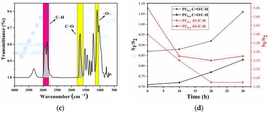 (a) ATR-FTIR spectra of PU0.1 coating after different CE times; (b) ATR-FTIR spectra of PU0.4 coating after different CE times; (c) peak area of C–H, C=O and C–O–C in FTIR spectrum; (d) the ratio of C=O to C–H and C–O–C to C–H of PU0.1 and PU0.4 varies with CE time.