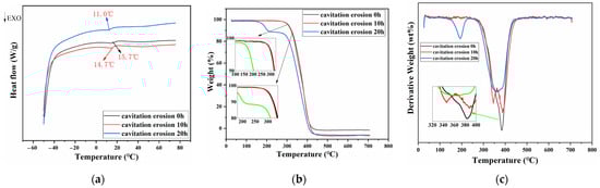 The changes in molecular structure caused by cavitation load and heat were also reflected in their thermal properties. Figure 12 shows the thermal properties of the PU coatings after different CE times. The glass transition temperature (Tg) of polyurethane gradually decreased with increasing CE time, and it had decreased by 4.7 °C at 20 h. This proved that the crosslinked structure of polyurethane was indeed damaged by the hydrolysis, pyrolysis and thermal oxidation, and it was difficult to restrict the movement of the molecular chain. Furthermore, the initial decomposition temperature of the material decreased from 332.6 °C to 321.3 °C after CE for 10 h and rapidly decreased to 170.8 °C after CE for 20 h. More seriously, the double decomposition peaks on the TGA curve became more obvious after the CE test, especially after CE for 20 h, when the two decomposition peaks were in two completely different temperature ranges (see Figure 12b). The gradually separated double decomposition peaks could be seen more clearly in the DTG curve after the first derivative treatment of the TGA curve. As shown in Figure 12c, the decomposition peak of polyurethane without CE was not obvious in the low temperature range, but it was obviously convex at about 321 °C after CE for 10 h. When the CE time reached 20 h, the decomposition peak in the low temperature range was not only more obvious but also significantly reduced to about 170.8 °C.