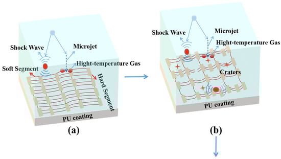Considering all the above test results, the anti–CE and CE mechanisms of PU coatings were proposed. At the start of the CE test, the polyether polyurethane coating with homogeneous microstructure, high fracture strength and good thermal stability could effectively consume the mechanical impact energy brought by the cavitation load through elastic deformation and intermolecular energy transfer, so the CE mass loss was low. As CE time increased, the degree of microphase separation of polyurethane was aggravated by the cavitation load, which enriched the brittle hard segment on the surface (see Figure 13b). Meanwhile, the cavitation heat exacerbated molecular chain breakage and caused additional defects such as craters to emerge. Thus, the surface mechanical properties deteriorated rapidly, ultimately resulting in the development of massive fatigue cracks and the brittle exfoliation of materials (see Figure 13c,d). Among the five coatings, PU0.4 showed the lowest CE mass loss rate under the mechano-thermal coupling action because it had good mechanical and thermal properties as well as low water absorption.