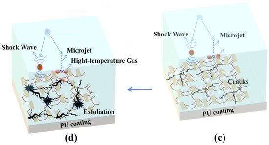 Schematic diagram of the CE damage mechanisms of polyurethane coating (a) Impact energy absorption; (b) Molecular chain breakage; (c) Crack extension; (d) Brittle exfoliation.