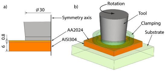 For the prediction of the thermal field and material flow in the P-FSSW process for AA2024/AISI, 304 welds were performed using the finite element software Simufact Forming® 2021. Based on the previous studies [24,26], the metal flow was purely axisymmetric; therefore, quad 2D elements were used to mesh all the parts of the P-FSSW CAD model (Figure 2b). In the model, the rotating tool, clamping system, and substrate were defined as rigid bodies, whereas the plates to be welded were deformable bodies. The initial element sizes were chosen as 0.07 mm for the AA2024 plate (upper plate) and 0.2 mm for the AISI304 plate. The initial element sizes of the rigid bodies varied from 0.2 mm (tool, clamping system) to 0.7 mm (substrate). The friction coefficient applied between the workpiece and the tool governed by Coulomb’s friction law with a simplified contact condition of sliding friction was 0.1.