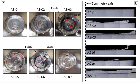 The upper-surface view and corresponding cross-section for each sample are presented in Figure 3. Several conditions were observed among the upper surfaces and corresponding cross-sections: thinning with a small flash volume (AS-01, AS-05), partial distortion with a medium flash volume (AS-02 and AS-06), and a complete metallurgical bond with the highest (AS-03) and least (AS-07) volumes of flash.
