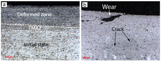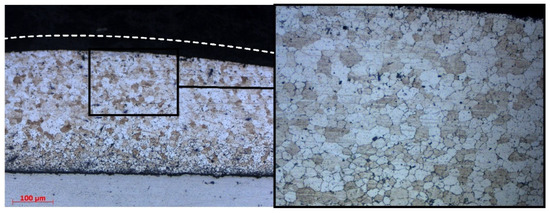 The AISI304 side showed the rolled grain structure of the initial state (see Figure 1b) without microstructure changes.