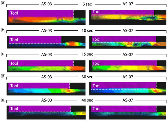 Material flow in samples AS-03 and AS-07 at the different time stages (a–e).
