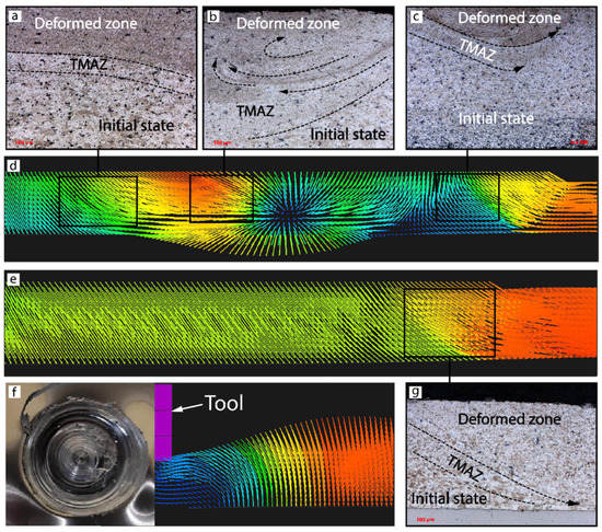 Microstructure (a–c) and material flow (d) of AA2024 plate in sample AS-07 at 1000 RPM and a 4900 N load force; material flow (e,f) and microstructure (g) of AA2024 plate in sample AS-03 at 1000 RPM and a 7350 N load force. The blue color represent low material flow, while the red one high material flow.