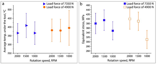 Numerical results of average temperature (a) and equivalent stress (b) along the tool shoulder–workpiece interface as a function of load force and rotation speed combination.