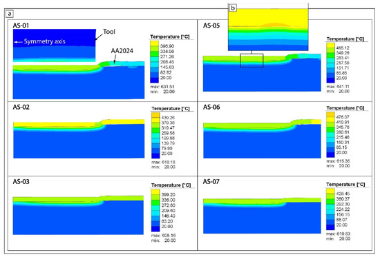 Figure 9 shows the numerical results on the influence of the welding parameters regarding the temperature field in the cross-sections of weld spots. The temperature had a uniform distribution with the maximum value found along the tool shoulder–workpiece interface. The maximum temperature of a friction solid process can range from 80% to 90% of the melting point as measured by Tang W. et al. [29] and the average temperature at the shoulder–workpiece interface can reach 90–95% of the melting temperature [30]. The maximum {peak} temperature of 630–640 °C at the AA2024-AISI304 interface was generated at 2000 RPM (samples AS-01 and AS-05), whereas the minimum temperature of about 610 °C was observed at 1000 RPM (samples AS-03 and AS-07). Both peak temperatures were greater than the melting point of the AA2024 alloy (602 °C) due to the great differences in the materials’ thermal properties (see Table 2) and the thermal contact resistance between the two plates (Figure 9b).