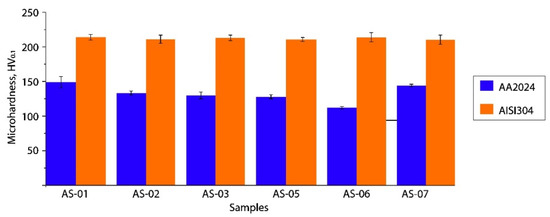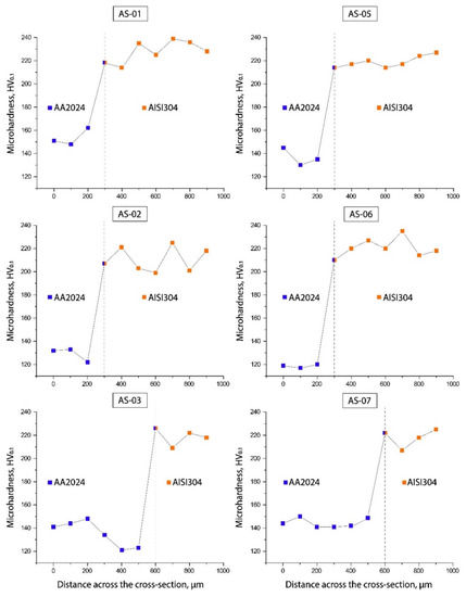 All the samples showed similar results for the average microhardness profiles (Figure 10). Figure 11 presents the microhardness trends in the cross-sections of each P-FSSW weld. The upper area of the aluminum plate was characterized by a higher microhardness with respect to the base metal due to the grain refinement and a reprecipitation process that might have taken place during the cooling of the heat treatable AA2024 alloy, whereas the TMAZ and HAZ were low due to the coarsening or dissolution of the hardening precipitates. The main differences in the microhardness distributions of samples AS-03 and AS-07 were consistent with the material high plastic deformation flow, and the most uniform microhardness distribution was seen in sample AS-07.