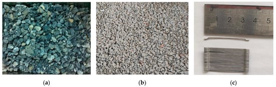 The appearance of materials: (a) Natural coarse aggregate, (b) recycled coarse aggregate, (c) steel fibers.