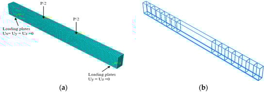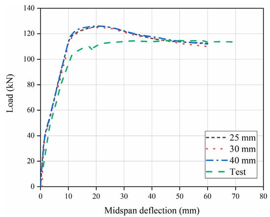 To investigate the effect of the steel fiber volume fraction, concrete strength, and recycled aggregate replacement ratio factors on the flexural behavior of SFRAC beams, the flexural behavior tests on eight SFRAC beams were simulated (see Figure 3). The model was divided into five components: Concrete, steel plate, hoop, compressive steel bars, and tensile steel bars. Concrete was modeled through solid three-dimensional (3D) elements (C3D8), whereas 2-node truss elements (T3D2) were employed for steel bars. The bond between the two materials was assumed perfect at their common nodal points. Different mesh sizes were searched to select the most suitable size (sensitivity analysis). The model was simulated with 25, 30, and 40 mm mesh sizes to check the convergence of the solutions (see Figure 4). Depending on the sensitivity analysis, a suitable mesh was adopted. The FEA model of 30 mm mesh size was used for all specimens, as given in Figure 3, keeping in mind that the selected mesh size should balance between accuracy in evaluated results and computational time. The boundaries are set according to the same restrictions as the actual test. Embedded regions can be used to integrate truss element parts into concrete solid element parts. Steel bar cage parts are selected for the embedded part, and concrete beam parts are selected for the main area. The coupling constraints are set at the bottom of the steel plate. The left support was constrained for the displacement degrees of freedom in the X, Y, and Z directions, while the right support was constrained for the displacement degrees of freedom in the Y and Z directions. The displacement control loading method was employed for loading.